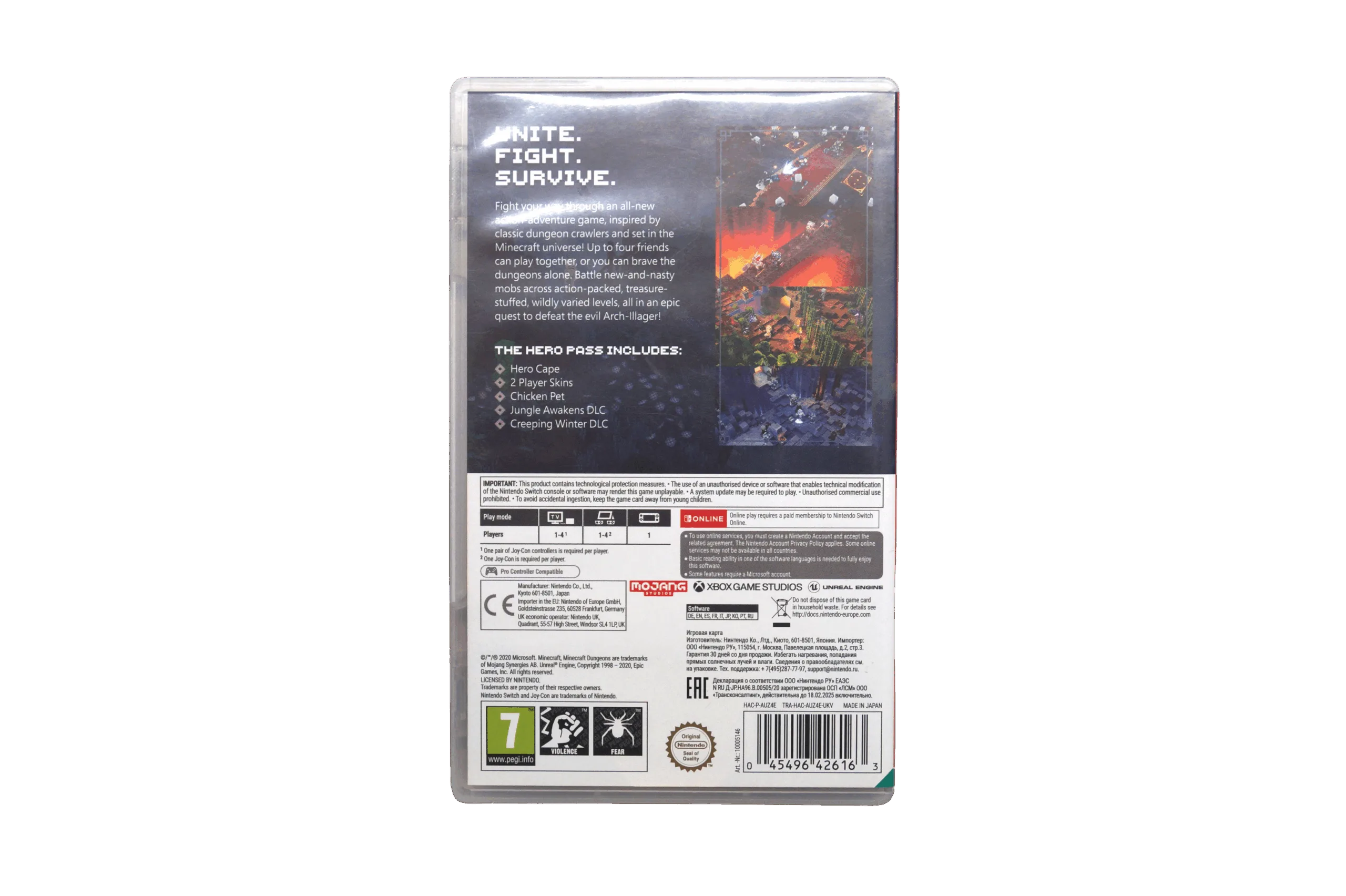 Tag på et episk dungeon crawl-eventyr i Minecraft-universet! I Minecraft Dungeons kæmper du dig gennem actionfyldte baner fyldt med fjender, fælder og skatte. Hero Edition inkluderer ekstra indhold såsom Hero Cape, to DLC-pakker og kosmetiske genstande. Spillet har ingen klassesystem, så du kan spille præcis som du vil – alene eller med venner i lokalt eller online co-op.